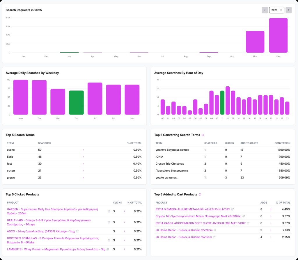 - Queries with no results (opportunities to add products or synonyms).