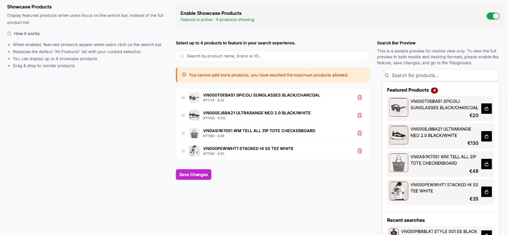 Product Showcase is a global "Featured Products" feature that displays when users open the search widget with an empty query. These are the first products users see before typing anything, making it ideal for promoting featured items, seasonal products, or high-margin goods.