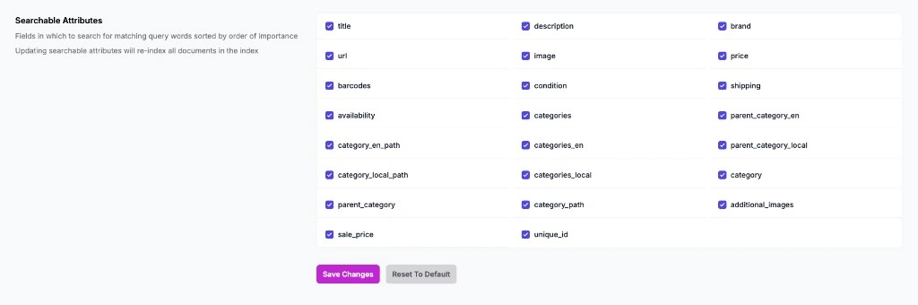SearchX indexes all fields (*) by default to ensure maximum discoverability across your entire product catalog. This means every attribute — title, description, brand, categories, SKU, and any custom fields — is searchable out of the box.